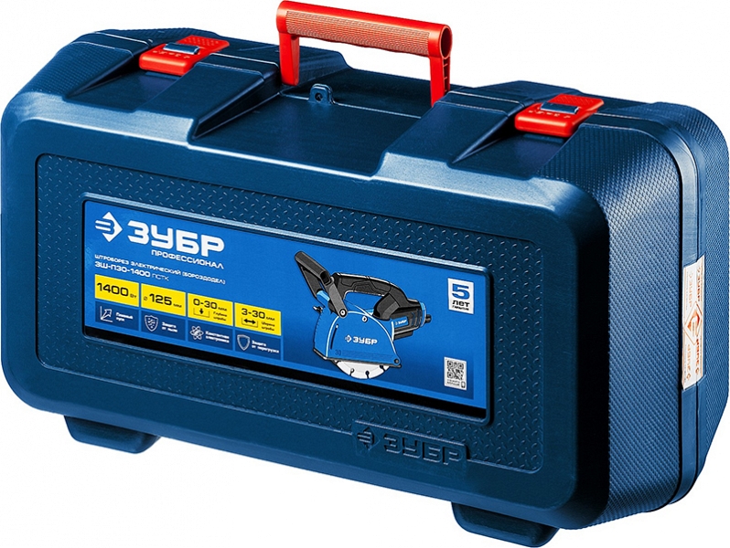 Штроборез Зубр Профессионал ЗШ-П30-1400 ПСТК (Zubr Professional ZSH-P30-1400 PSTK) – профессиональный инструмент для выполнения штроб глубиной до 30 мм и шириной 3 – 30 мм в легких и средних бетонах. Расширенная (по сравнению с ЗШ-П30-1400 ПСТ) комплектация включает удобный кейс для хранения и переноски. Легкость и компактность позволяют длительно держать его на весу при работе на вертикальных поверхностях.